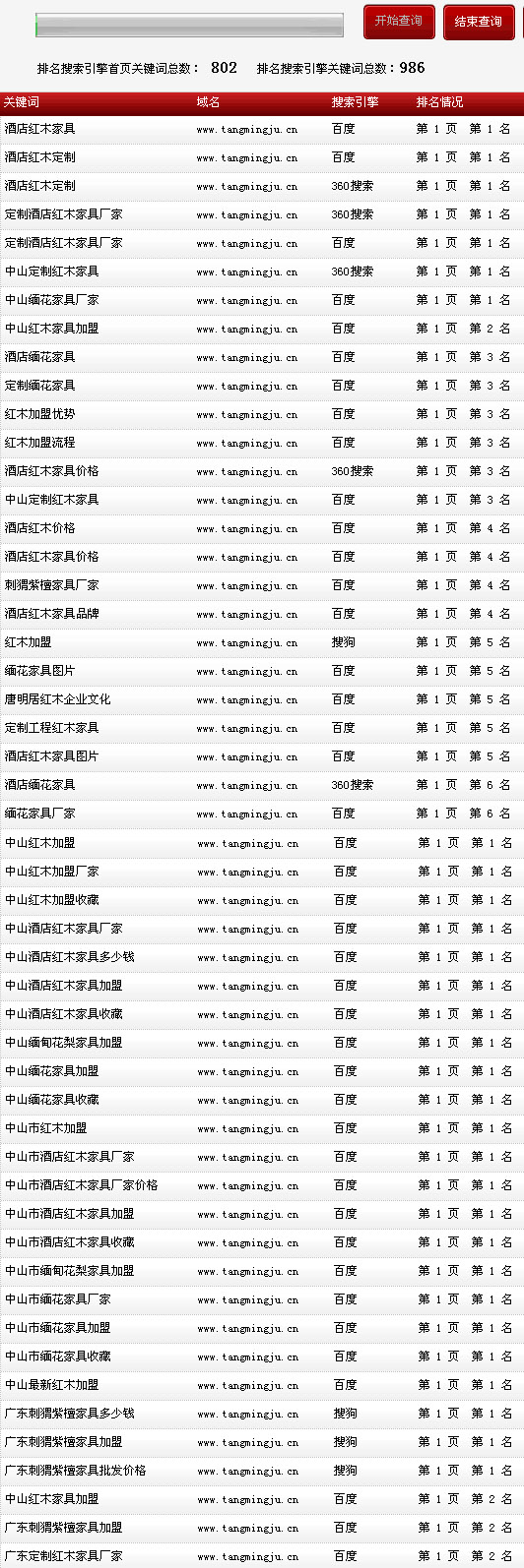 | 我們明顯看到,可以清楚地顯示出搜索引擎的排名狀況,連這樣的長(zhǎng)尾詞:中山酒店紅木家具廠家價(jià)格,都可以搜索出來啊,真是太棒了! |