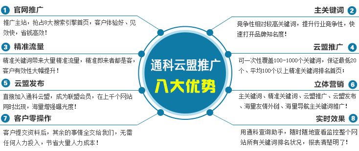 | 我們根據(jù)客戶提供的網(wǎng)站進行優(yōu)化調(diào)整,之后加入通科云盟系統(tǒng),分享云盟大系統(tǒng)的海量資源。 | 根據(jù)百度鳳巢系統(tǒng),與客戶協(xié)商匹配好關(guān)鍵詞,讓每個客戶的關(guān)鍵詞都有專業(yè)性、針對性!絕對精準(zhǔn)超值! | 贈送通科云盟關(guān)鍵詞查詢助手,清楚查詢當(dāng)天實時關(guān)鍵詞排名情況,網(wǎng)站狀況了然于胸!確保關(guān)鍵詞排名首頁! |
