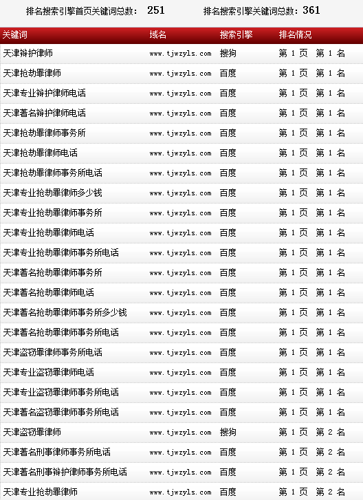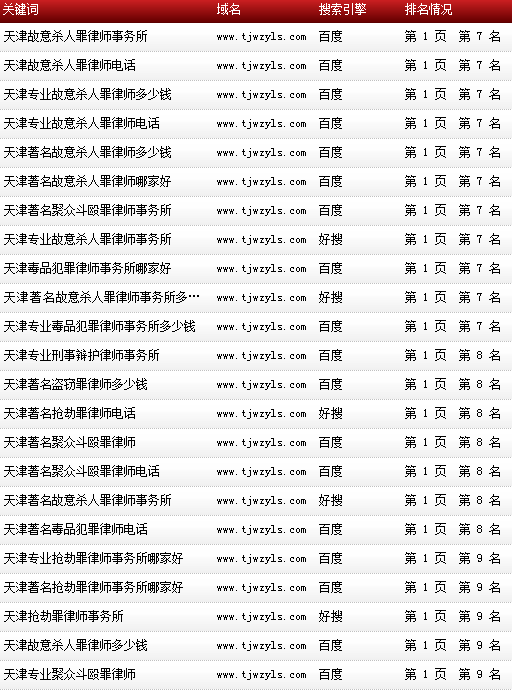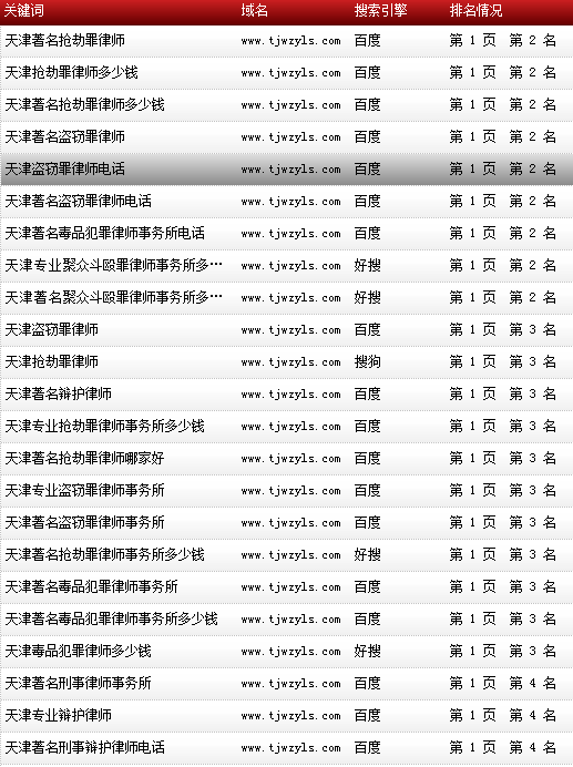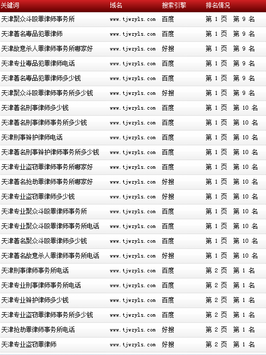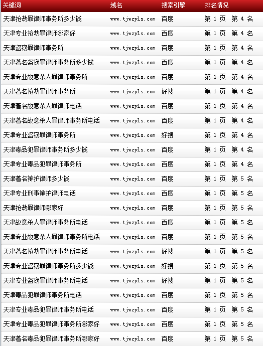 各關(guān)鍵詞在各大搜索引擎排名情況: